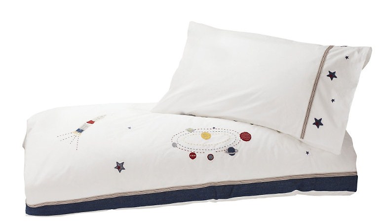 There are loads of bedsets emblazoned with in-your-face spaceships and aliens, but I rather like the understated appliqued rocket, satellite and solar system of this 200-thread count cotton and denim duvet cover from The White Company, £38 for cotbed size.