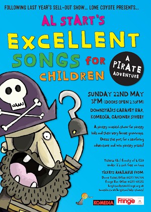 Ahoy, me hearties (aka Brighton youngsters)! If you’re a fan of either singing or pirates (or both), then tell your parents to book you a ticket for Al Start’s Excellent Songs for Children (A Pirate Adventure). Featuring much swashbuckling, super-catchy sea shanties, a Salon de Mer (for your barnet) and all sorts of other treasures, it promises to be a popular addition to the Fringe Festival line-up. Musician Start’s show was a sell-out last year, so you’ll need to be quick. There are two performances on Sunday 22 May (1pm and 3pm) at the Komedia – £6 per ticket or £20 for a family of four (under twos go free) - and if you go along in seafaring-themed fancy dress you’ll be in the running for pirate booty. Yo ho ho! If you don’t manage to get tickets, you can buy Start’s CD, featuring quirky numbers, such as Gorrid the Horrid and Little Green Men, which is accompanied by a beautifully illustrated book of lyrics. You’ll be pleased to hear that all songs pass the crucial ‘bearable for adults’ test.