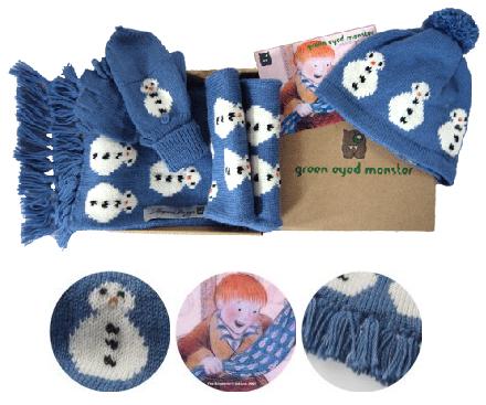 Each gift set contains a scarf, hat and gloves. The print is the very same as the scarf given to James in The Snowman by Father Christmas himself. They are made from high quality alpaca wool which is soft and warm. It all comes beautifully packaged in a Green Eyed Monster box with a postcard featuring James opening the scarf.