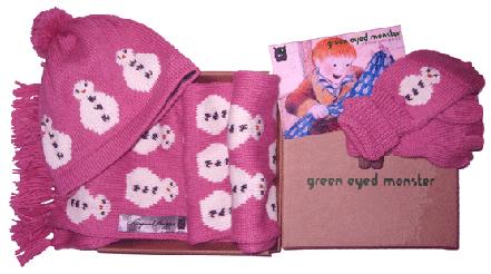 2. Competition prize is one of two Complete Snowman Giftsets of scarf, hat and gloves one in pink and one in blue. You will be notified by email if you have won and your details will be passed to Green Eyed Monster so they can arrange for you to receive your prize.