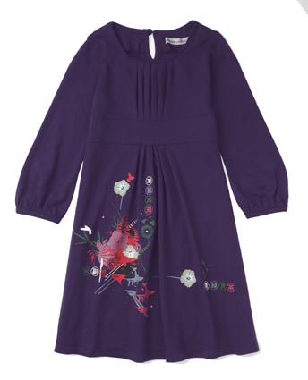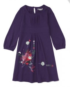 The organic cotton jersey Akina Dress features more Japanese influences. It has a modern floral design on the skirt embellished with sparkle-tastic Swarovski crystalline. It brings together key themes for this season; the rich purple is a must have to warm you in the winter weather, the pin tucks are bang on trend and the bell sleeves finish the look. It would look great over some brightly coloured stripey tights. From 1- 2 through to 9 – 10 years from £32.50.