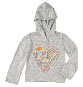 The Digital Love Jumper is getting some serious Kat love. I saw this at Bubble and immediately had it pegged as a Grandma present! It is made from a beautifully soft fairtrade Alpaca wool blend. The heart patch motif is hand embroidered with funky digital designs. It has mittens attached to the sleeves which are held back by a small button when not in use and a hood to keep little heads warm on windy days. From 1 – 2 through to 7 – 8 years from £36.