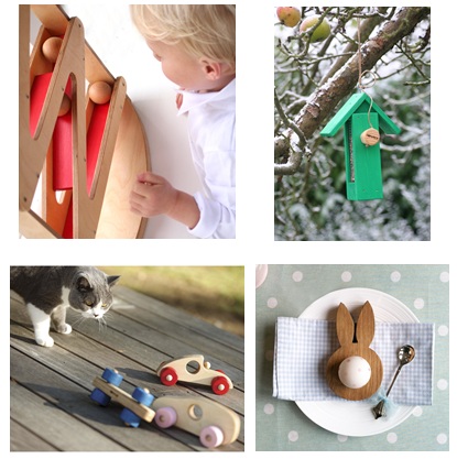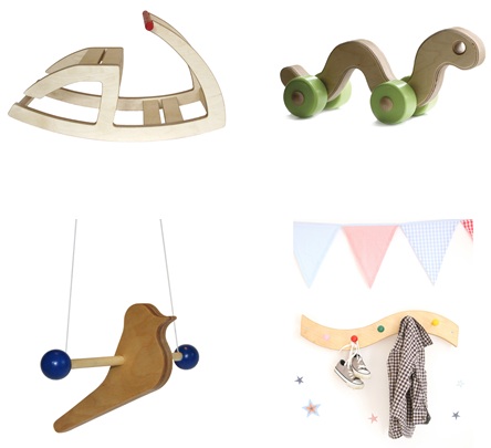 All of their products are designed with both style and enjoyment in mind. They are handmade from high quality beech plywood and are shaped ergonomically. Their toys embrace the most simple principles of traditional fun for children. They have cars, a click clack ball run (below, top left) and push & pull toys. They also create decor items such as mobiles and clothes pegs as well as wooden egg cups and bird feeders. I adore their modern rocker (above, top left) which at £119.95 is highly competitive in its market.