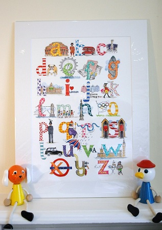 The print is a glorious hand drawn alphabet featuring London’s iconic landmarks and residents including the ever present rain. It is the work of British illustrator Kate Anniss who not only creates beautiful artworks for children’s rooms but illustrates books as well.