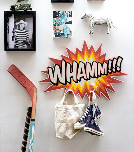 I have been looking for some hooks to hang our ever expanding fancy dress collection and I think this is possibly the most perfect solution. This comic styled coat hook from Danish designers Pakuis Oost is silk-screened formica and has three pegs for hanging coats, bags or even capes.