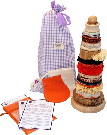 There are twenty different stacking hoops made of diverse tactile materials including banana leaf, recycled sari thread, mother of pearl, bamboo, recycled leather, wood, soap stone, metal and felt to name but some. The various rings are made around the world and use ethical projects which support communities in Africa and India. There are also rings produced in the UK by craftsmen and members of Thaxted Centre for the Disabled. The stacking hoops come with their own gingham bag, differently textured mini bags and an activity card to give you some ideas on initiating play and exploration.