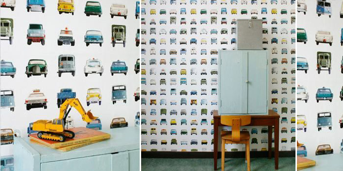 I am a tad partial to wallpaper in children’s rooms and this design has made its way on to my top ten (yes, I have such a list). Made by Dutch Studio Ditte this is a high quality non-woven wipe clean paper. The cars are images of vintage toy cars complete with play damage. I think the ordered rows of colourful cars look amazing against the bright white background. They also make wallpaper with birdhouses, ribbons and vintage porcelain plates (below).